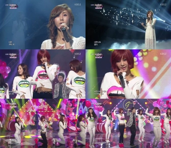 지나는 15일 방송된 KBS 2TV '뮤직뱅크’에 출연해 신곡 ‘밉다 싫다’와 ‘웁스’를 연이어 열창했다.