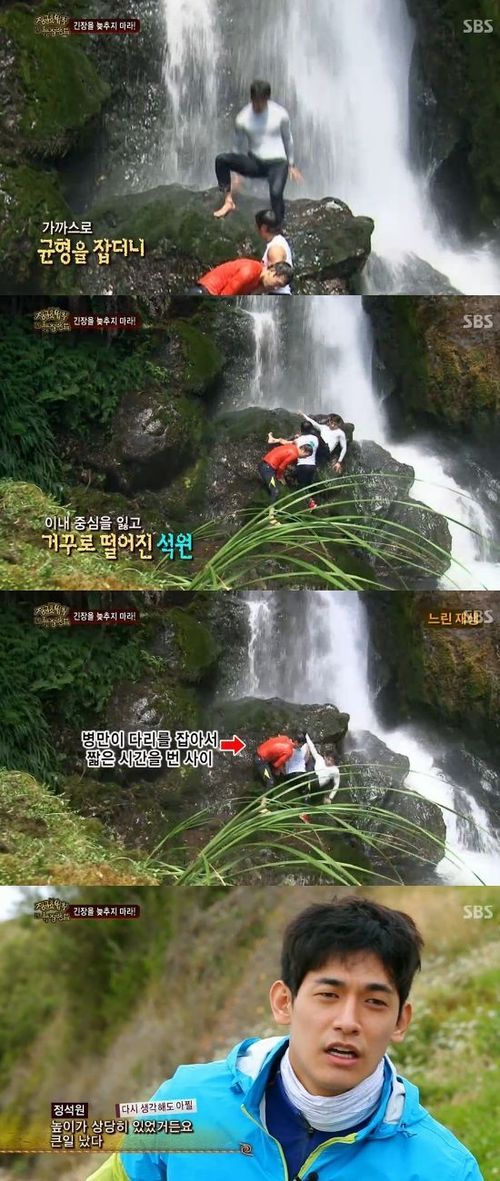 배우 정석원과 개그맨 김병만이 높은 폭포에서 추락하는 위기일발의 상황을 겪었다.