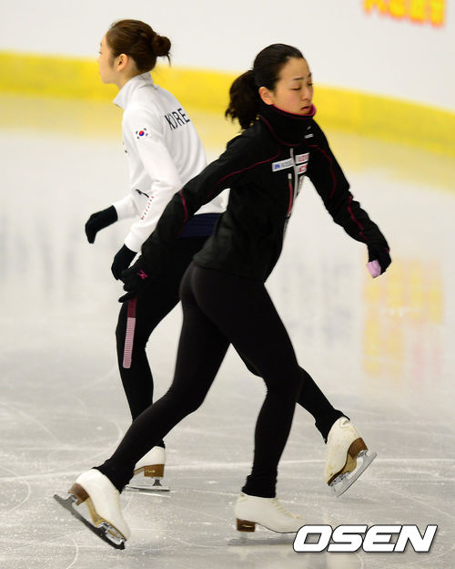 김연아와 아사다 마오가 연습을 준비하고 있다.