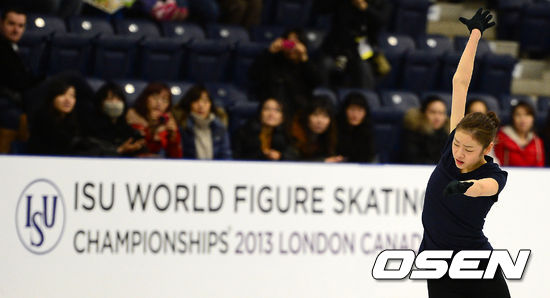 김연아는 15일 버드와이저 가든스에서 열린 2013 국제빙상경기연맹(ISU) 피겨스케이팅 세계선수권대회 여자 싱글 쇼트프로그램(SP) 경기서 기술점수(TES) 36.79점 예술점수(PCS) 33.18점을 받아 총점 69.97점을 기록, 1위에 올랐다. 2위 카롤리나 코스트너(이탈리아, 66.86점)와는 3.11점차. 아사다 마오(일본)는 62.10점으로 6위에 그쳤다.
