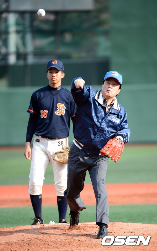 16일 오전 서울 목동구장에서 열린 '2013 고교야구 주말리그' 개막전 휘문고와 성남고의 경기에 앞서 이병석 대한야구협회장이 시구를 하고 있다.