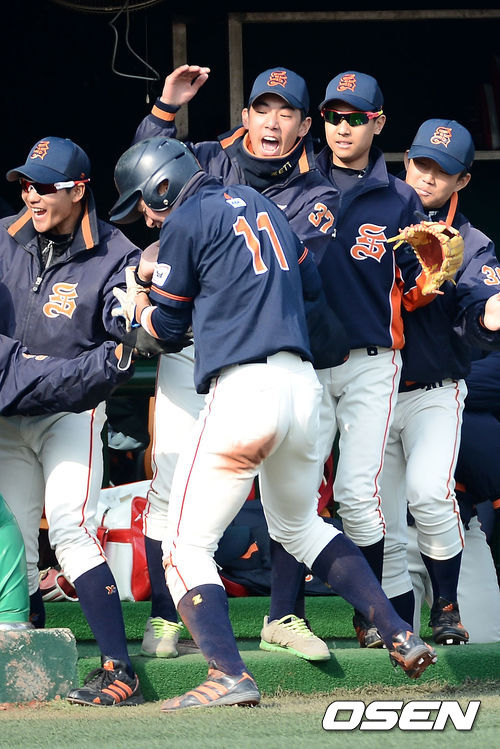 16일 오전 서울 목동구장에서 열린 '2013 고교야구 주말리그' 개막전 휘문고와 성남고의 경기, 1회말 1사 1,3루 성남고 김도형의 중견수 희생플라이때 3루주자 오병권이 득점을 올린 뒤 더그아웃에서 동료들과 기뻐하고 있다.