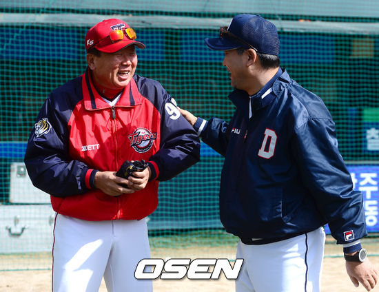 16일 오후 광주구장에서 열리는 '2013 한국야쿠르트 세븐 프로야구' KIA 타이거즈와 두산 베어스의 시범경기 전 선동렬 감독과 김진욱 감독이 인사를 나누고 있다.