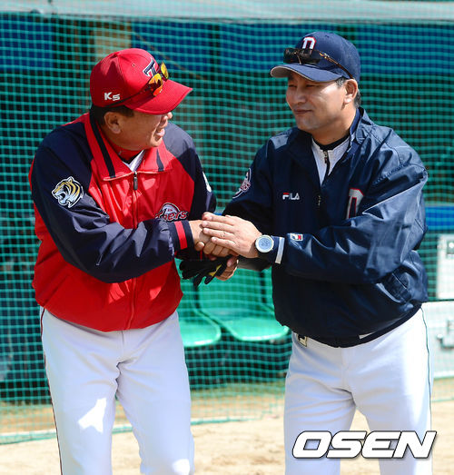 16일 오후 광주구장에서 열리는 '2013 한국야쿠르트 세븐 프로야구' KIA 타이거즈와 두산 베어스의 시범경기 전 선동렬 감독과 김진욱 감독이 인사를 나누고 있다.