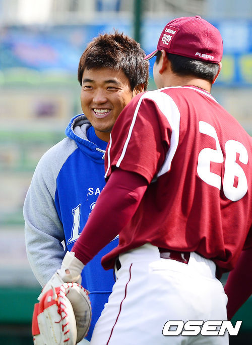 경기 전 삼성 박석민이 넥센 최경철과 즐겁게 얘기를 나누고 있다.