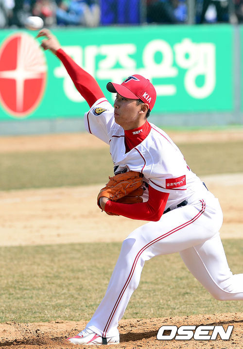 16일 오후 광주구장에서 열린 '2013 한국야쿠르트 세븐 프로야구' KIA 타이거즈와 두산 베어스의 시범경기 7회초 교체된 박지훈이 역투하고 있다.
