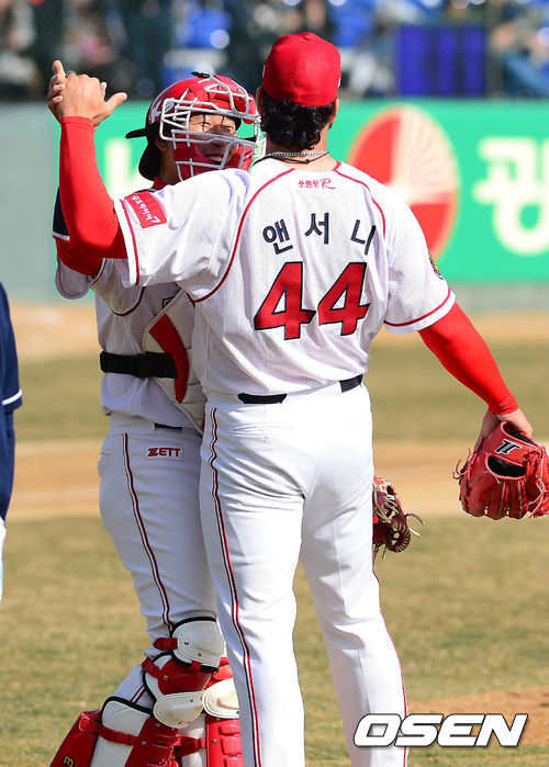 16일 오후 광주구장에서 열린 '2013 한국야쿠르트 세븐 프로야구' KIA 타이거즈와 두산 베어스의 시범경기 종료 후 앤서니와 이성우가 승리를 기뻐하며 하이파이브를 하고 있다.