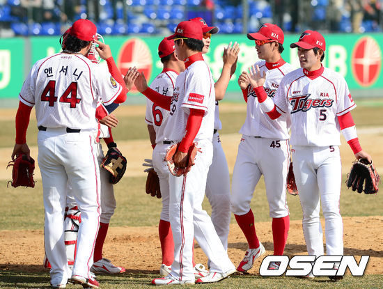 16일 오후 광주구장에서 열린 '2013 한국야쿠르트 세븐 프로야구' KIA 타이거즈와 두산 베어스의 시범경기 종료 후 KIA 선수들이 하이파이브를 하고 있다.