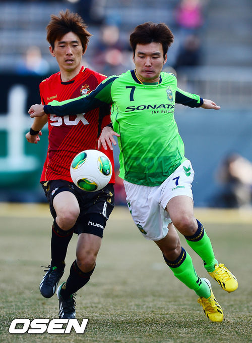 16일 오후 경상남도 창원시 성산구 창원축구센터에서 열린 경남 FC와 전북 현대의 현대오일뱅크 K리그 클래식 2013 경기에서 전반 전북 서상민과 경남 조재철이 볼다툼을 하고 있다.