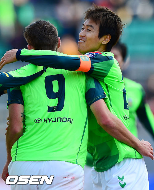 16일 오후 경상남도 창원시 성산구 창원축구센터에서 열린 경남 FC와 전북 현대의 현대오일뱅크 K리그 클래식 2013 경기에서 전반 전북 이동국이 선취골을 넣은 케빈과 기쁨을 나누고 있다.