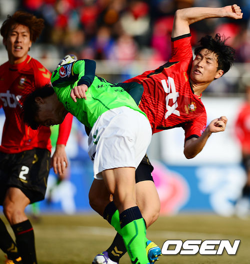 16일 오후 경상남도 창원시 성산구 창원축구센터에서 열린 경남 FC와 전북 현대의 현대오일뱅크 K리그 클래식 2013 경기에서 전반 경남 정다훤이 볼을 걷어내려 할때 전북 박원재가 헤딩슛을 시도하며 위험한 플레이가 되고 있다.