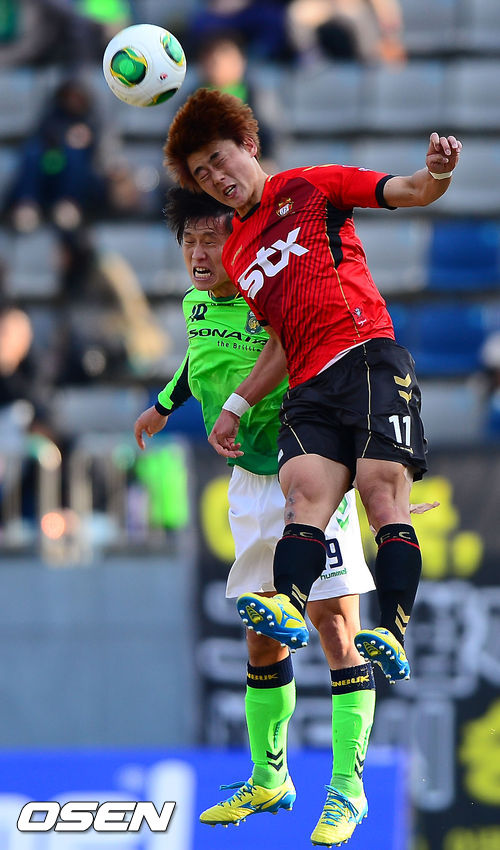 16일 오후 경상남도 창원시 성산구 창원축구센터에서 열린 경남 FC와 전북 현대의 현대오일뱅크 K리그 클래식 2013 경기에서 전반 경남 김인한과 전북 박원재가 공중볼 다툼을 하고 있다.