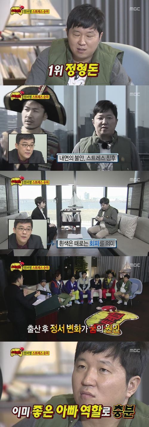 이날 멤버들은 스트레스 검사를 받은 후 스트레스 순위가 공개됐다. 노홍철이 스트레스 순위에서 7위를 차지했지만 이와는 달리 정형돈이 1위를 기록했다.