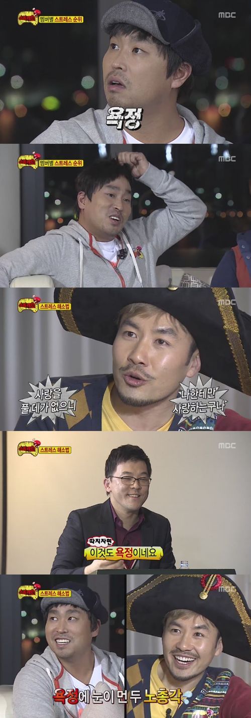 이날 멤버들은 모두 각각 스트레스 지수와 개인 면담을 받고 스트레스 순위를 발표했다. 스트레스가 가장 낮은 사람은 노홍철과 길. 그러나 두 사람은 다른 멤버들 보다 욕정이 많은 것으로 밝혀졌다.