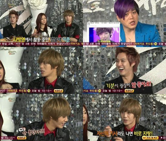 그는 이날 "이준에 대한 좋은 기사가 나면 기분이 어떤가"라는 MC 문희준의 질문에 "기분이 상당히 안 좋다. '나 안 볼란다' 이러면서 삐진다"고 밝혀 웃음을 자아냈다.