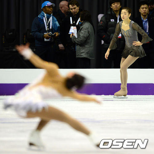 김연아가 아사다 마오의 드레스 리허설을 바라보고 있다.