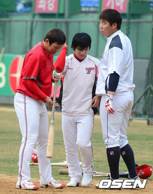 17일 오후 광주구장에서 열리는 '2013 한국야쿠르트 세븐 프로야구' KIA 타이거즈와 두산 베어스의 시범경기 시작 전 안치홍이 김현수의 배트를 살펴보고 있다.