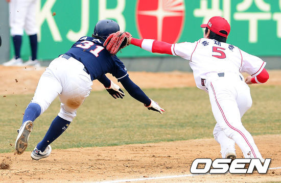 17일 오후 광주구장에서 열린 '2013 한국야쿠르트 세븐 프로야구' KIA 타이거즈와 두산 베어스의 시범경기 4회초 1사 1,3루 이종욱의 1루수 앞 땅볼 상황, 홈으로 쇄도하던 3루주자 정수빈이 3루로 돌아오는 중 홍재호에 태그아웃 당하고 있다.