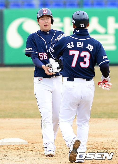17일 오후 광주구장에서 열린 '2013 한국야쿠르트 세븐 프로야구' KIA 타이거즈와 두산 베어스의 시범경기 4회초 2사 만루 박건우가 3타점 2루타를 친 후 김민재 코치와 하이파이브를 하고 있다.