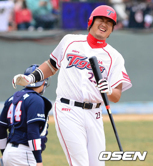 17일 오후 광주구장에서 열린 '2013 한국야쿠르트 세븐 프로야구' KIA 타이거즈와 두산 베어스의 시범경기 5회말 1사 1루 최희섭이 파울을 친 후 아쉬워하고 있다.
