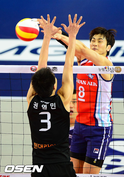 17일 오후 충청남도 천안시 서북구 백석동 유관순 체육관에서 열린 2012-2013 NH농협 V리그 포스트시즌 플레이오프 1차전 현대캐피탈과 대한항공의 경기에서 대한항공 김학민이 현대캐피탈 권영민의 블로킹을 피해 연타를 넣고 있다.