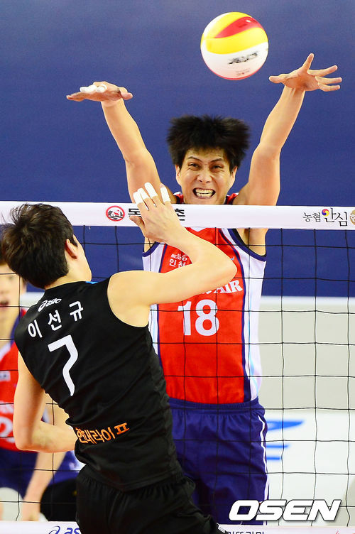17일 오후 충청남도 천안시 서북구 백석동 유관순 체육관에서 열린 2012-2013 NH농협 V리그 포스트시즌 플레이오프 1차전 현대캐피탈과 대한항공의 경기에서 대한항공 하경민이 현대캐피탈 이선규의 강타를 블로킹하고 있다.