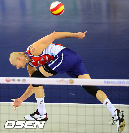 17일 오후 충청남도 천안시 서북구 백석동 유관순 체육관에서 열린 2012-2013 NH농협 V리그 포스트시즌 플레이오프 1차전 현대캐피탈과 대한항공의 경기에서 대한항공 마틴이 볼을 받아내지 못하고 있다.