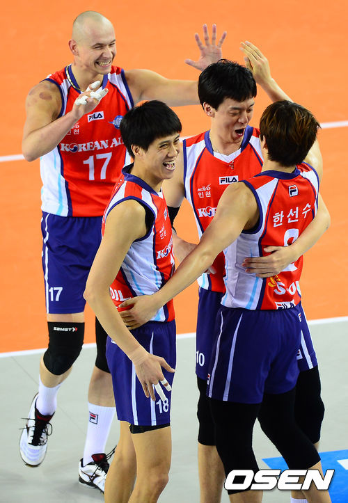 17일 오후 충청남도 천안시 서북구 백석동 유관순 체육관에서 열린 2012-2013 NH농협 V리그 포스트시즌 플레이오프 1차전 현대캐피탈과 대한항공의 경기에서 1세트를 먼저 이긴 대한항공 선수들이 기쁨을 나누고 있다.