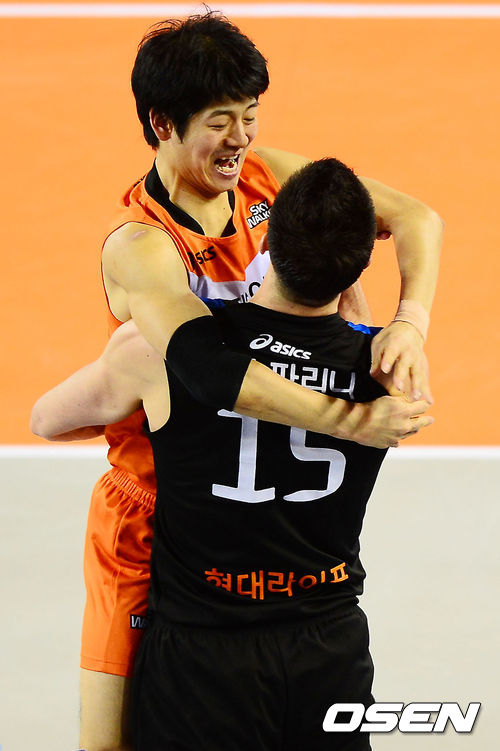 17일 오후 충청남도 천안시 서북구 백석동 유관순 체육관에서 열린 2012-2013 NH농협 V리그 포스트시즌 플레이오프 1차전 현대캐피탈과 대한항공의 경기에서 현대캐피탈 가스파리니가 공격에 성공하자 박종영이 그에게 안기고 있다.