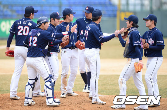 17일 오후 광주구장에서 열린 '2013 한국야쿠르트 세븐 프로야구' KIA 타이거즈와 두산 베어스의 시범경기 종료 후 두산 선수들이 하이파이브를 하고 있다.