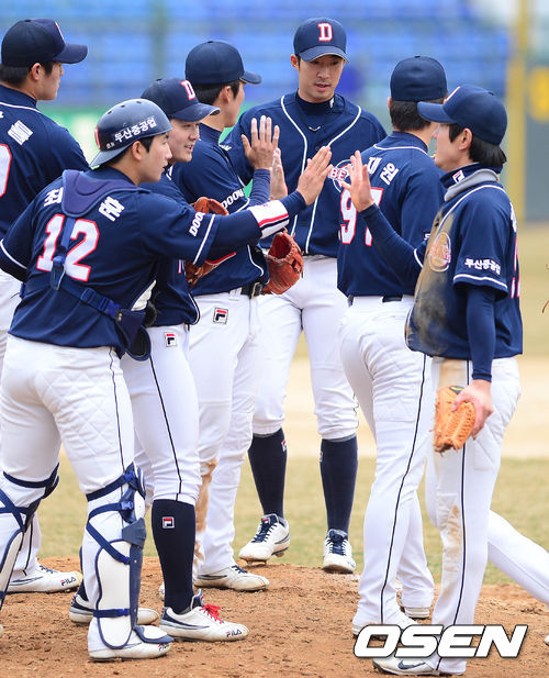 17일 오후 광주구장에서 열린 '2013 한국야쿠르트 세븐 프로야구' KIA 타이거즈와 두산 베어스의 시범경기 종료 후 두산 선수들이 하이파이브를 하고 있다.