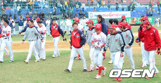 17일 오후 광주구장에서 열린 '2013 한국야쿠르트 세븐 프로야구' KIA 타이거즈와 두산 베어스의 시범경기 종료 후 KIA 선수들이 그라운드를 빠져나가고 있다.