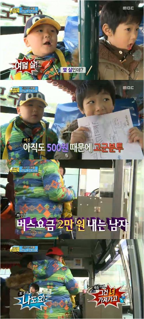 결국 윤후는 버스기사에게 2만원을 건넸다. 두 사람의 버스요금은 단돈 천원이었지만 돈계산을 하지 못하는 윤후는 만원짜리 두장을 내밀었다. 버스기사는 다급한 목소리로 한 장만 내라고 말해 웃음을 자아냈다.