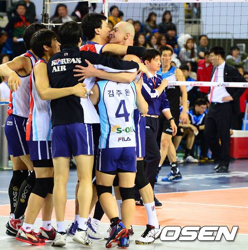 김종민 감독대행이 지휘하는 대한항공은 17일 천안 유관순체육관서 열린 2012-2013 V리그 플레이오프 1차전 현대캐피탈과 원정경기서 3-2(25-23 24-26 22-25 26-24 15-12)로 승리를 거뒀다. 이로써 대한항공은 챔피언결정전 진출에 있어 유리한 고지를 점하게 됐다.