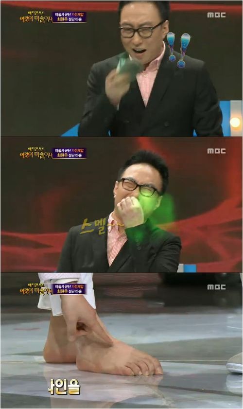 얼떨결에 양말을 벗게 된 박명수는 양말에서 나는 발냄새를 느끼며 자신의 개인기인 “스멜” 표정을 지었다. 제작진은 독한 발냄새가 나는 것처럼 컴퓨터 그래픽을 입혀 웃음을 자아냈다.