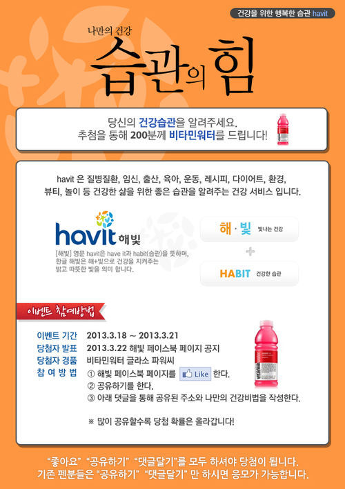 이벤트는 누구나 해빛 페이스북(http://www.facebook.com/havitcare)에 방문해 ‘좋아요’와 ‘공유하기’를 클릭한 뒤, 댓글에 자신만의 건강 노하우나 비법을 올리면 참여할 수 있다. 200명을 추첨해 ‘비타민워터’ 음료를 선물한다.