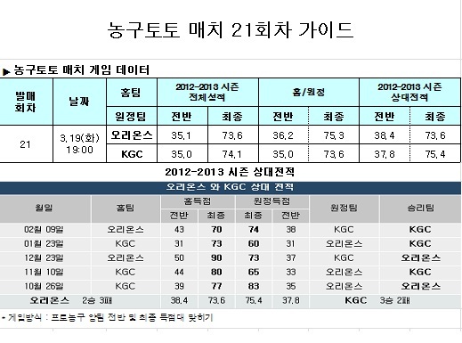 국민체육진흥공단(www.kspo.or.kr)이 발행하는 체육진흥투표권 수탁사업자 스포츠토토의 공식 온라인 발매사이트인 베트맨(www.betman.co.kr)이 오는 19일 오후 7시 고양체육관에서 열리는 오리온스-KGC전을 대상으로 한 농구토토 매치 21회차 투표율을 중간 집계한 결과, 40.97%가 홈팀 오리온스의 우세를 예상했다고 전했다.