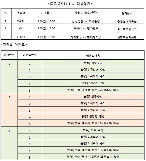 이번 11회차는 19일(화)에 벌어지는 WKBL 삼성생명-우리은행(1경기), KBL 모비스-전자랜드(2경기), KOVO 대한항공-현대캐피탈 전이 대상 경기로 지정된 가운데 1경기 이벤트는 홈팀 최종 승리를 포함해, 홈팀 1쿼터에 승리, 홈팀 3쿼터에 승리, 양팀 연장전 진행, 양팀 최종 총 득점합이 125점 보다 많음이 이벤트로 지정됐다.