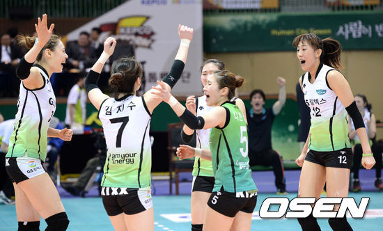 18일 오후 경기 수원실내체육관에서 열린 '2012-2013 NH농협 V-리그' 플레이오프 2차전 현대건설과 GS칼텍스의 경기, 2세트를 승리한 GS칼텍스 선수들이 환호하고 있다.