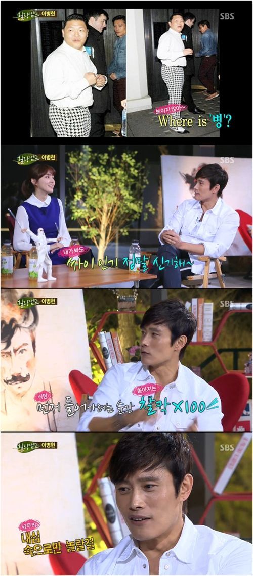 이병헌은 18일 방송된 SBS 토크쇼 ‘힐링캠프, 기쁘지 아니한가’에서 월드스타로서 또 다른 월드스타 싸이에 대해 “영국 헬스클럽에서 운동을 하는데 하루에 세 번 싸이의 ‘강남스타일’이 나왔다”고 싸이의 인기를 전했다.