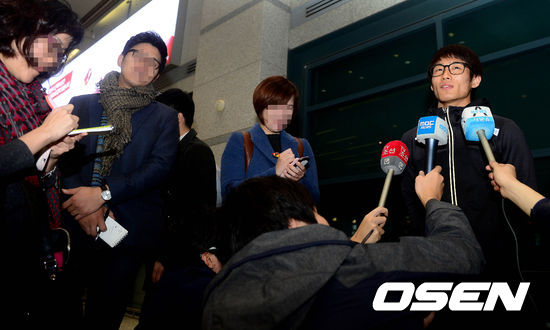 19일 오전 인천국제공항을 통해 입국한 양학선이 입국장에서 취재진들과 인터뷰를 하고 있다.