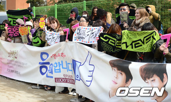 19일 오후 경기도 의정부 306보충대에서 가수 세븐의 입소에 앞서 팬들이 응원 도구를 들고 포즈를 취하고 있다.