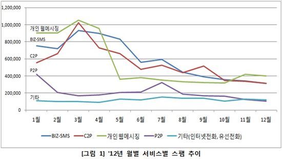 2012년 하반기 1인1일 평균 휴대전화 문자 스팸 수신량은 0.22통으로 전년 동기 0.26통 대비 15.4% 감소했으며(2012년 상반기 0.24통) 이메일 스팸 수신량 또한 2011년 하반기에는 2.19통이었으나 2012년 하반기에는 1.4통으로 줄어 전년 동기 대비 36.1% 감소했다(2012년 상반기 1.64통).