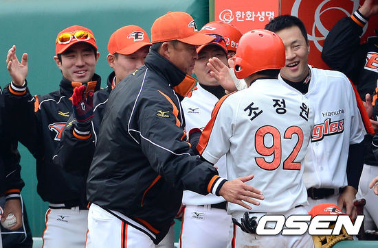 9회말 2사 1,2루 한화 추승우의 안타때 홈으로 쇄도해 득점을 올린 조정원이 동료들과 하이파이브를 하고 있다. / youngrae@osen.co.kr