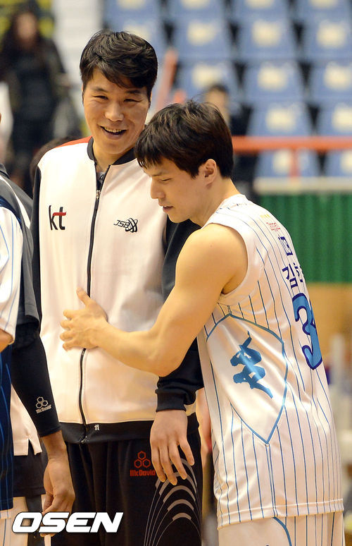 19일 오후 부산 사직실내체육관서 열린 '2012-2013 KB국민카드 남자프로농구' 부산 KT와 전주 KCC의 경기에 앞서 서장훈이 KCC 김효범과 포옹을 하고 있다.