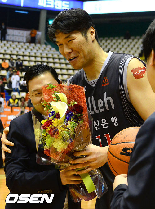 19일 오후 부산 사직실내체육관서 열린 '2012-2013 KB국민카드 남자프로농구' 부산 KT와 전주 KCC의 경기에 앞서 서장훈이 가수 싸이와 포옹을 하고 있다.