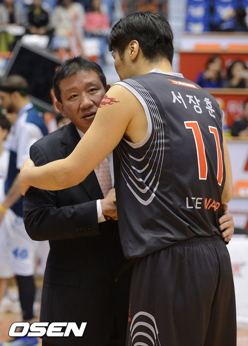 19일 오후 부산 사직실내체육관서 열린 '2012-2013 KB국민카드 남자프로농구' 부산 KT와 전주 KCC의 경기에 앞서 서장훈이 KCC 허재 감독과 포옹을 하고 있다
