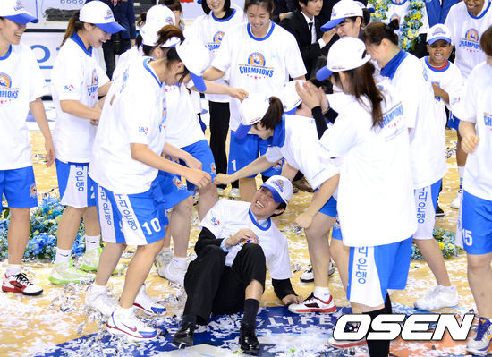 우승을 확정 지은 우리은행 선수들이 위성우 감독에게 구타 세리머니를 하고 있다. /sunday@osen.co.kr