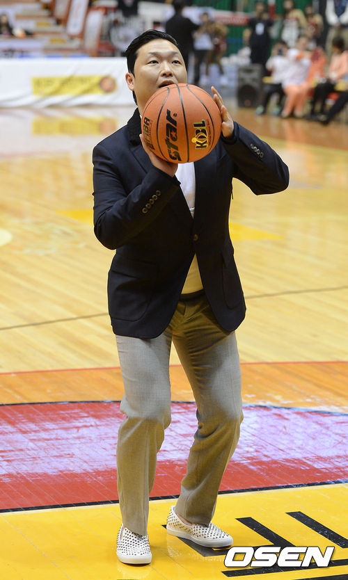 19일 오후 부산 사직실내체육관서 열린 '2012-2013 KB국민카드 남자프로농구' 부산 KT와 전주 KCC의 경기에 앞서 가수 싸이가 시투를 하고 있다