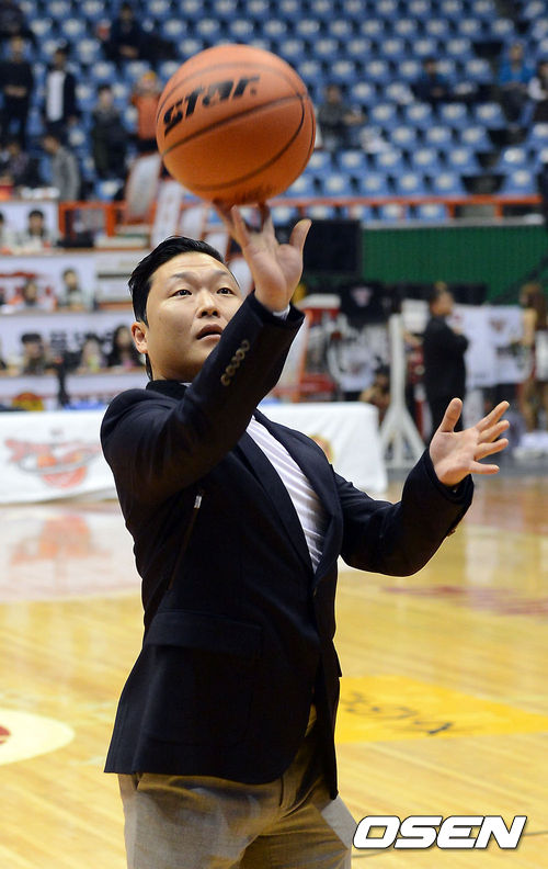 19일 오후 부산 사직실내체육관서 열린 '2012-2013 KB국민카드 남자프로농구' 부산 KT와 전주 KCC의 경기에 앞서 가수 싸이가 시투를 하고 있다